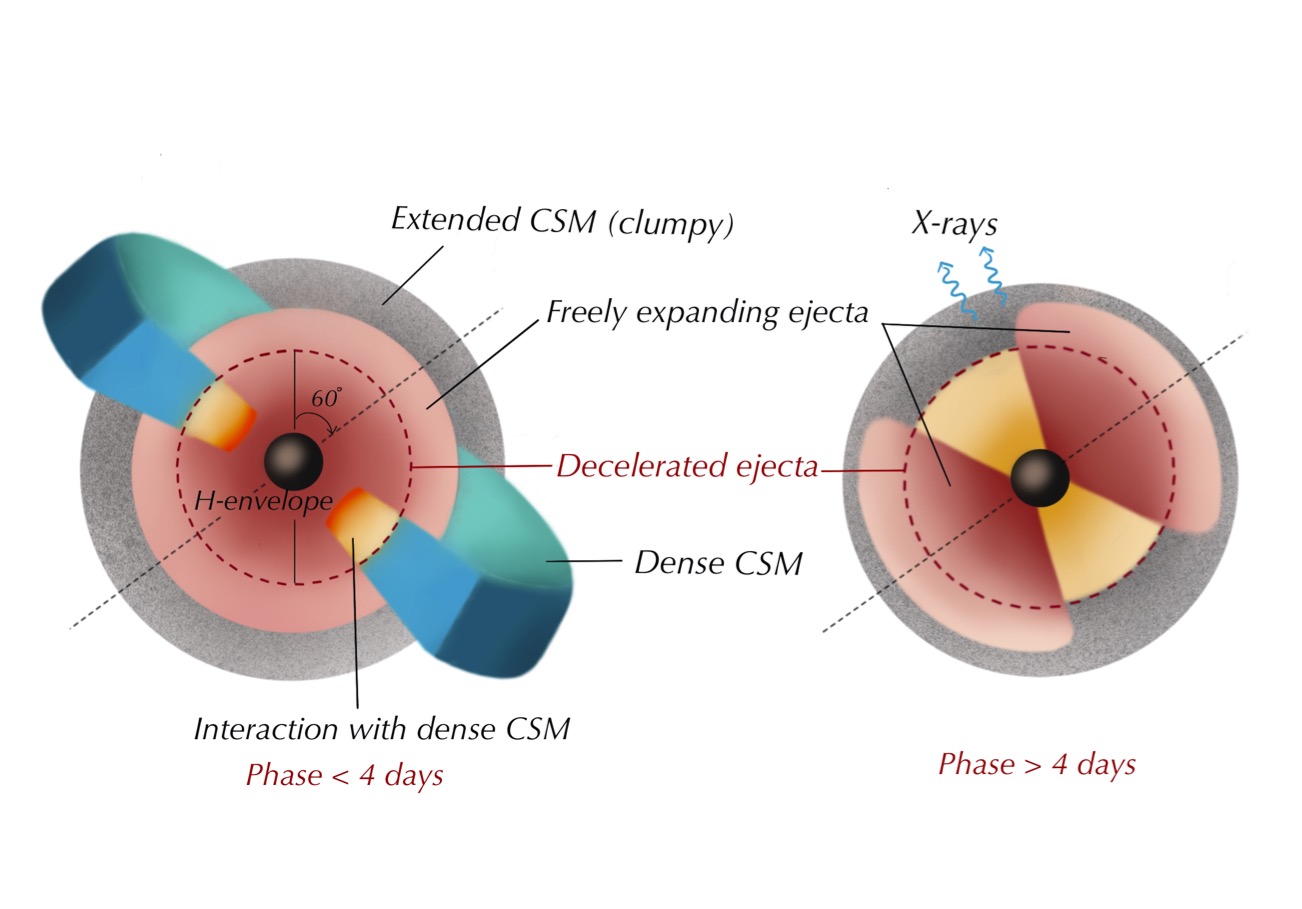 A central thread of my current work is the interaction between the exploding ejecta and the circumstellar material (CSM) shed by the progenitor in the years to decades before core collapse. I lead multi-wavelength campaigns on flash-ionised and interacting Type II supernovae, most recently with the nearby SN 2023ixf in M101 to investigative the explosion properties, infer CSM and ejecta geometries, and trace the onset of in situ dust formation in the nebular phase. I am also active in the electromagnetic follow-up of gravitational-wave events and in estimating volumetric rates of rare transient classes such as superluminous supernovae.